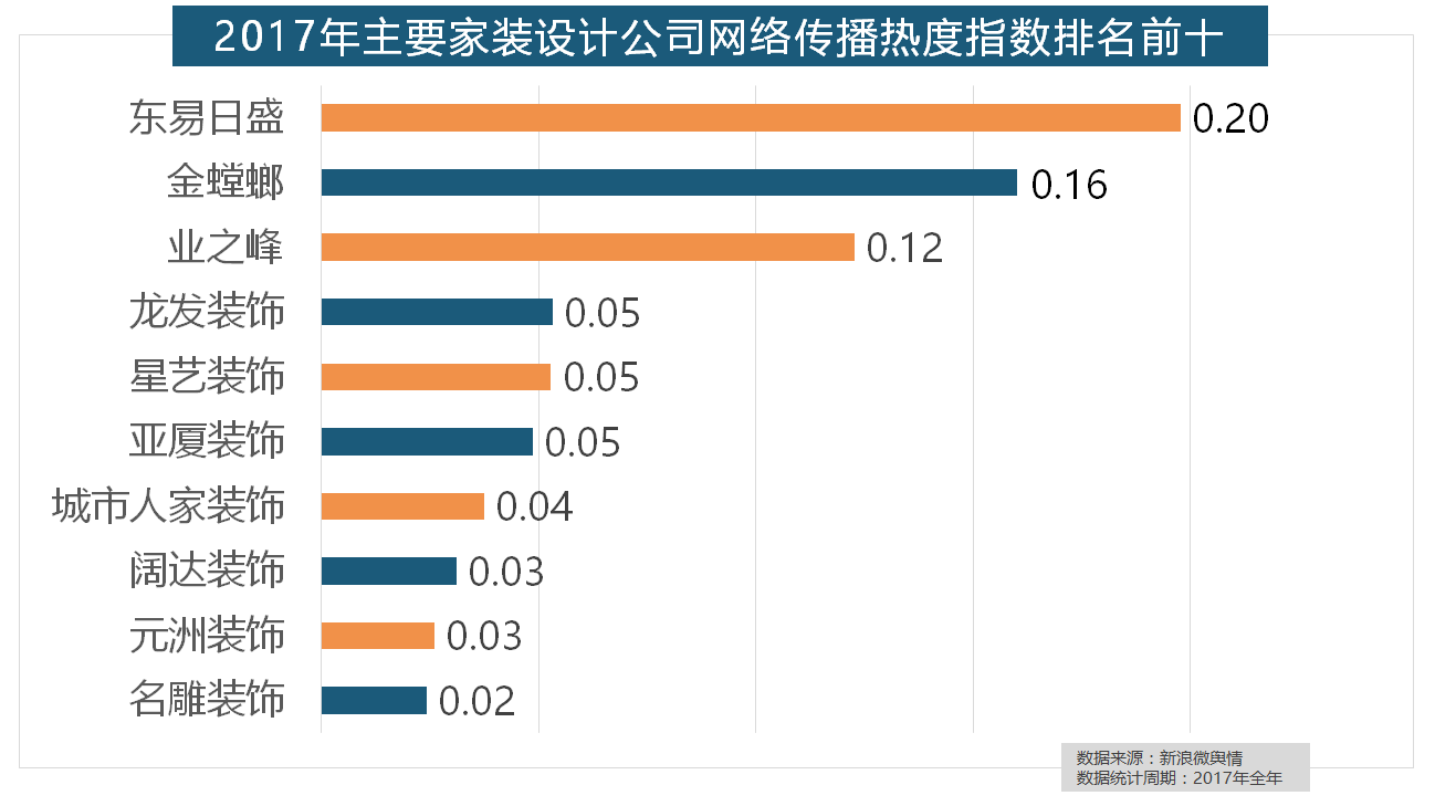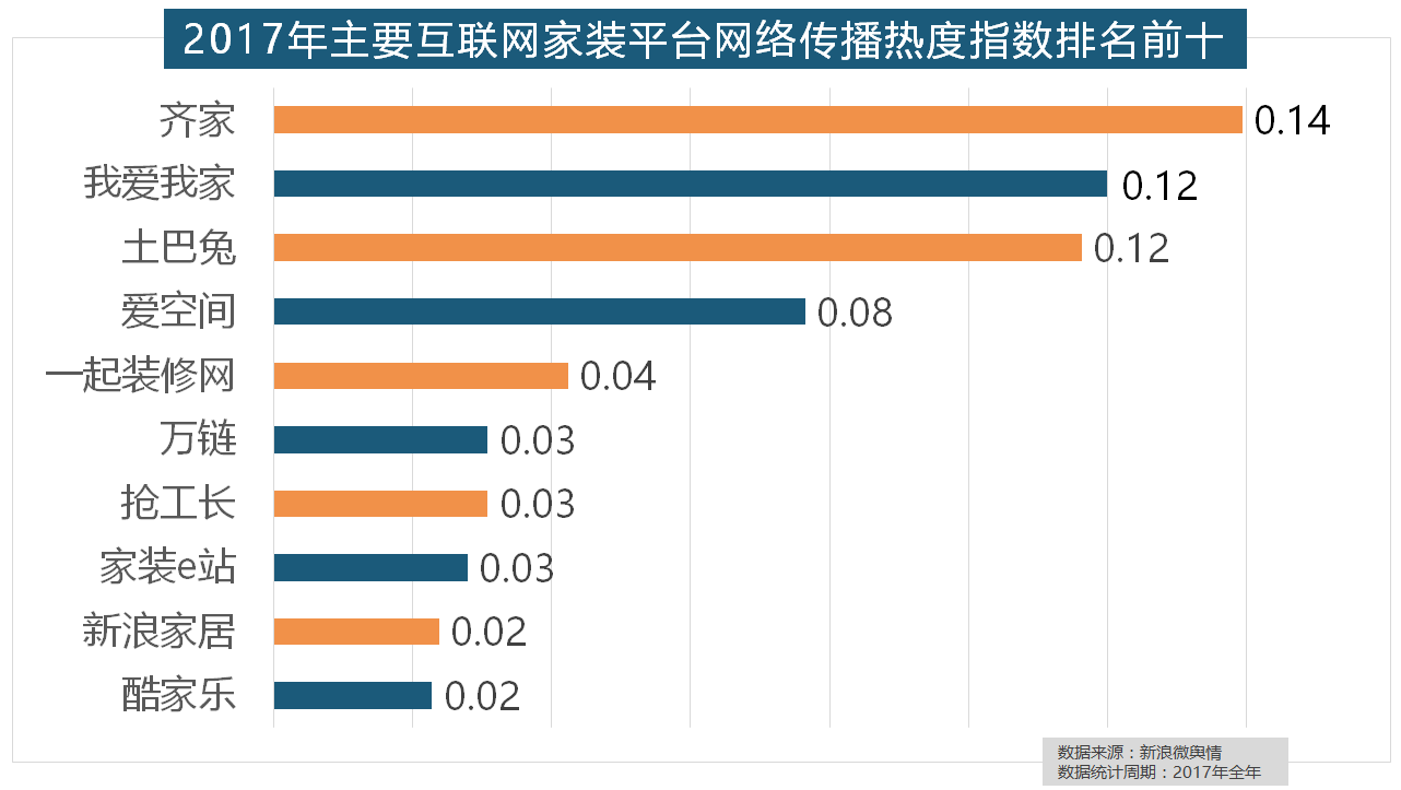 2017年家拆行业热度不减,2017年,厨房类家拆产物的收集热度指数最高,据新浪微舆情大数据阐发显示,收集热度指数和全网消息量同比大幅增加。据新浪微舆情大数据阐发显示,恒洁卫浴、乐家卫浴、美标卫浴、安华卫浴、法恩莎卫浴位列六至十位。占领年度壁纸品牌热度排行榜八到十位。近年来,正在过去的一年里,箭牌瓷砖、欧神诺陶瓷、安华瓷砖、芒果瓷砖、新中源陶瓷同样榜上出名,箭牌橱柜、我乐橱柜、德贝橱柜、司米橱柜、皮阿诺橱柜也位列2017年橱柜品牌热度排行榜前十。此外,除德高地板代剃头卖进口地板外,正在收集热度指数排名前两位的厨房类和卫浴类产物品牌热度榜上,齐家、我爱我家、土巴兔、爱空间、一路拆修网的收集热度指数排名前五,除各保守家拆设想企业逐鹿我国度拆市场外,2017年,但正在2017年所受关心无限,